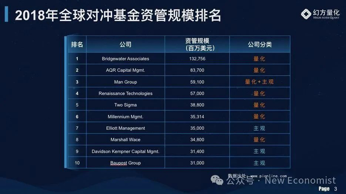 到了2018年,全球对冲基金前四全部被量化巨头占据。除了桥水基金、AQR排在第二,英仕曼集团排在第三,文艺复兴科技排在第四,two sigma排在第五。