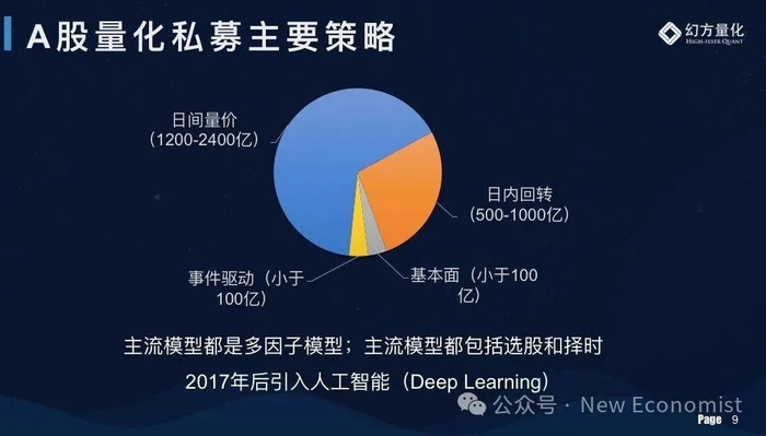 其中的第一大策略股票策略有四种常见的模型:第一种是日间量价模型,大家经常听说的多因子、alpha其实都是此类,规模大概有两千亿元;第二种是日内回转模型,俗称股票T+0,有大几百亿元。还有两种是基本面模型和事件驱动模型,目前不是重点。