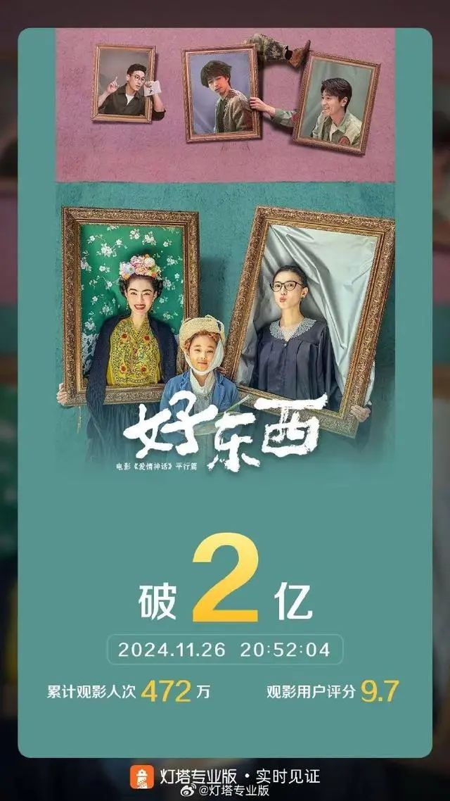 据灯塔专业版实时数据,截至11月26日20时52分,影片《好东西》票房突破2亿。在票房、排片率等方面都稳居第一。更为难得的是,《好东西》在豆瓣网上获得了9.1的超高分,一举成为今年截至目前口碑最高的国产电影。