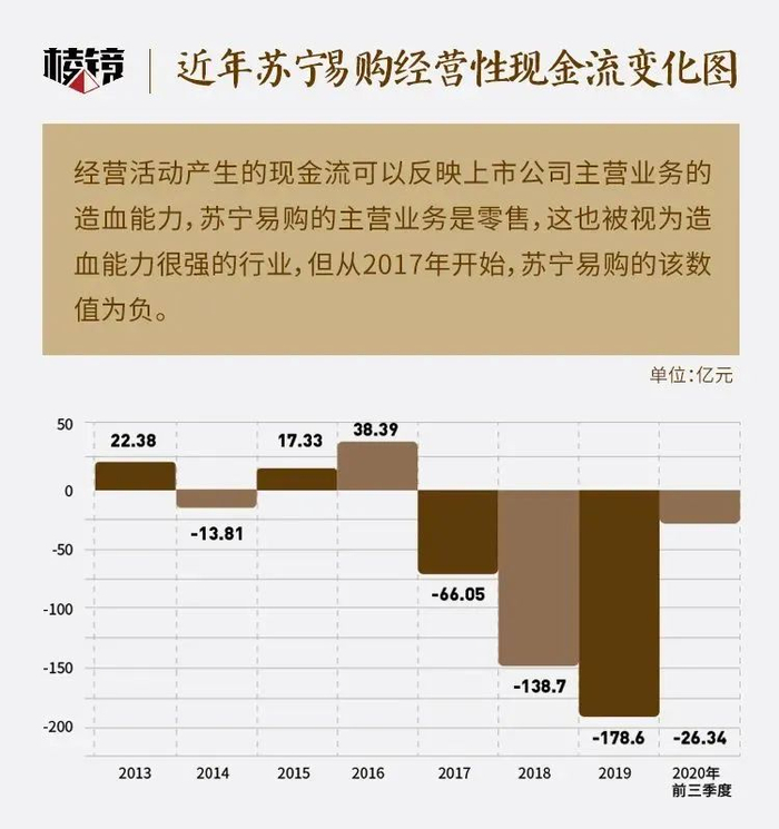 零售行业本是一个可以带来源源不断现金流的行业,但在苏宁易购这里,除了连续亏损外,经营性现金流也从2017年开始转负,并且流出额持续扩大。根据财报,2017年-2019年,苏宁易购的经营活动分别净流出66亿、139亿和178.65亿,2020年前三季度的净流出额也有24亿元。