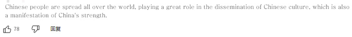 挪威网友说“华人遍世界,对中国文化的传播起到很好的作用,这也是中国实力的一种体现”,确实是这样。