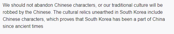 说什么“我们还是不要抛弃汉字,不然我们的传统文化都被中国人抢光了”“我们有众多出土的文物证明汉字起源于韩国,可惜我们现在不用汉字了”“虽然我们不用汉字但是还是可以对汉字申遗,我们没向中国人收费就不错了”。
