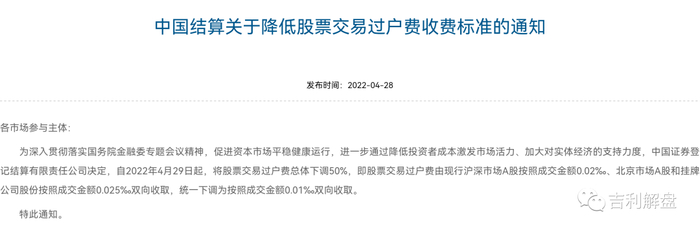 2022年4月28日,中国结算官宣,将过户费由原来的万0.25双向收取,统一下调为按照成交金额的万0.1双向收取