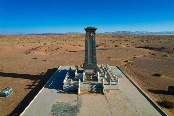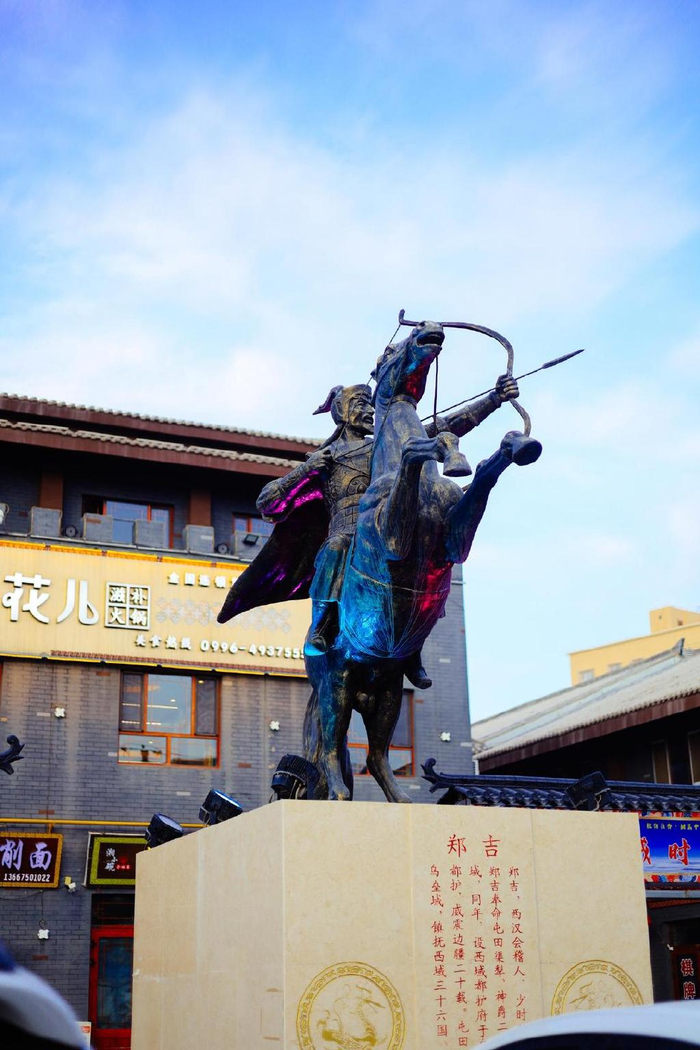 告别塔中路上胡杨逐渐粗壮也开始翠绿起来,西域都护府轮台就在眼前!我们在首任都护郑吉的塑像旁开怀畅饮,伊力老窖跟烤肉串太般配了!