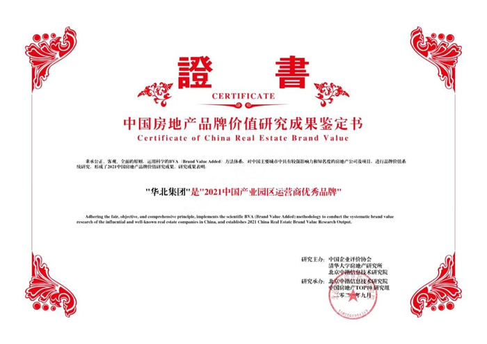 作为国内产业园区地产领域的先行者,华北集团始终坚持“不忘创业初心,接力改革伟业”的核心价值观,20年来深耕产业园之路,通过不断的研发与创新,产业园区品牌影响力持续扩大,企业品牌价值实现稳步提升,荣获“2021中国产业园区运营商优秀品牌”。