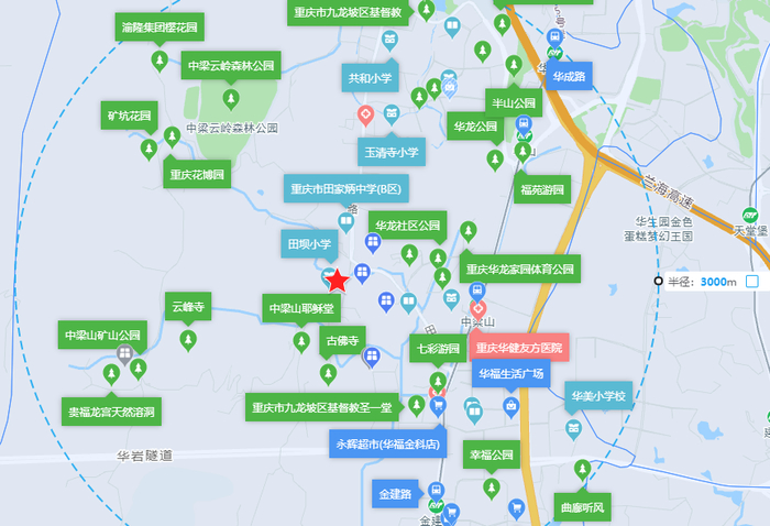 地块所处华岩板块处于发展阶段,现状投资价值较高,规划利好较多,有较大的增值空间,周边规划有商场,商业配套会有所提升,交通便利,邻近地铁5号线,多条公交线路环绕,且距离中梁山地铁站仅1.3km,周边生活氛围浓厚,教育、商业、医疗配套完善,地块3km范围内聚集了田坝小学、重庆市田家炳中学(B区)、二级医院重庆华健友方医院、叠彩西城·幸福广场等生活配套,周边有民康公园、中梁山耶稣堂等28个公园景点。