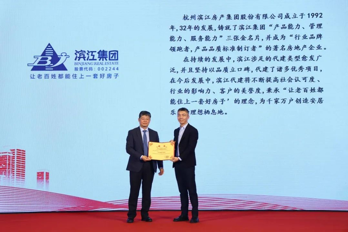 在本次会议中,滨江集团长期坚守产品主义,在品质与销量表现双优,凭借稳健经营的理念、优异的产品打造能力、与城投战略合作的业务优势,首次荣获“2024中国房地产代建运营优秀企业”。