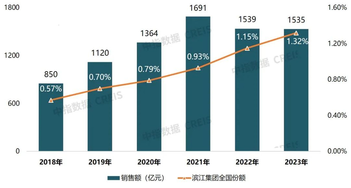 在稳业绩方面,滨江集团力保全国销售额1%的份额。截止2023年年末,滨江集团实现销售额1534.7亿元,占全国商品房销售额的1.32%,市场份额较2022年提升0.17个百分点。在杭州大本营,滨江集团以1276.7亿元销售额,稳居榜首之位,市场份额高达33.4%。