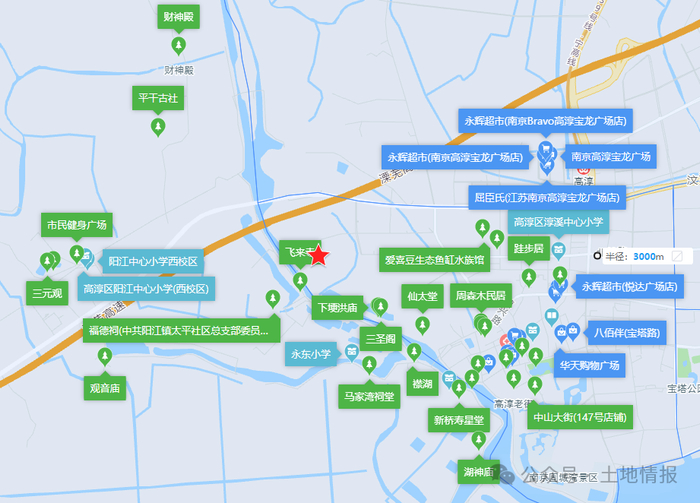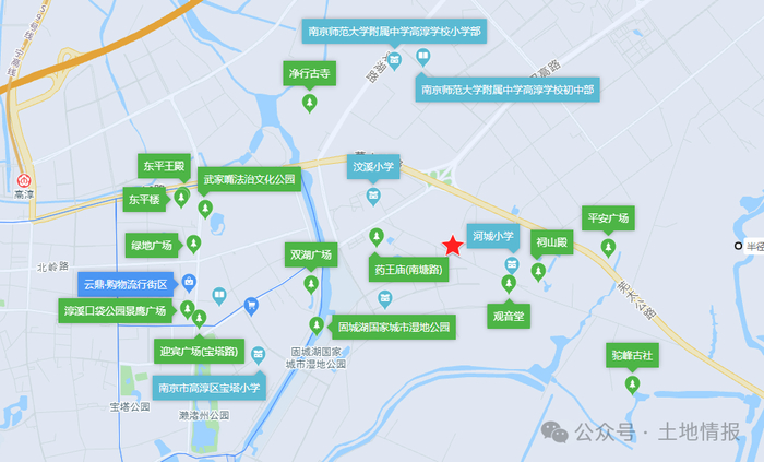 地块周边生活氛围浓厚,教育、商业、医疗配套完善,地块3km范围内聚集了省重点小学高淳区实验小学、高淳区第二中学、二级医院高淳中医院、购物中心富克斯流行广场等生活配套,周边有飞来寺、福德祠(中共阳江镇太平社区总支部委员会南)等30个公园景点
