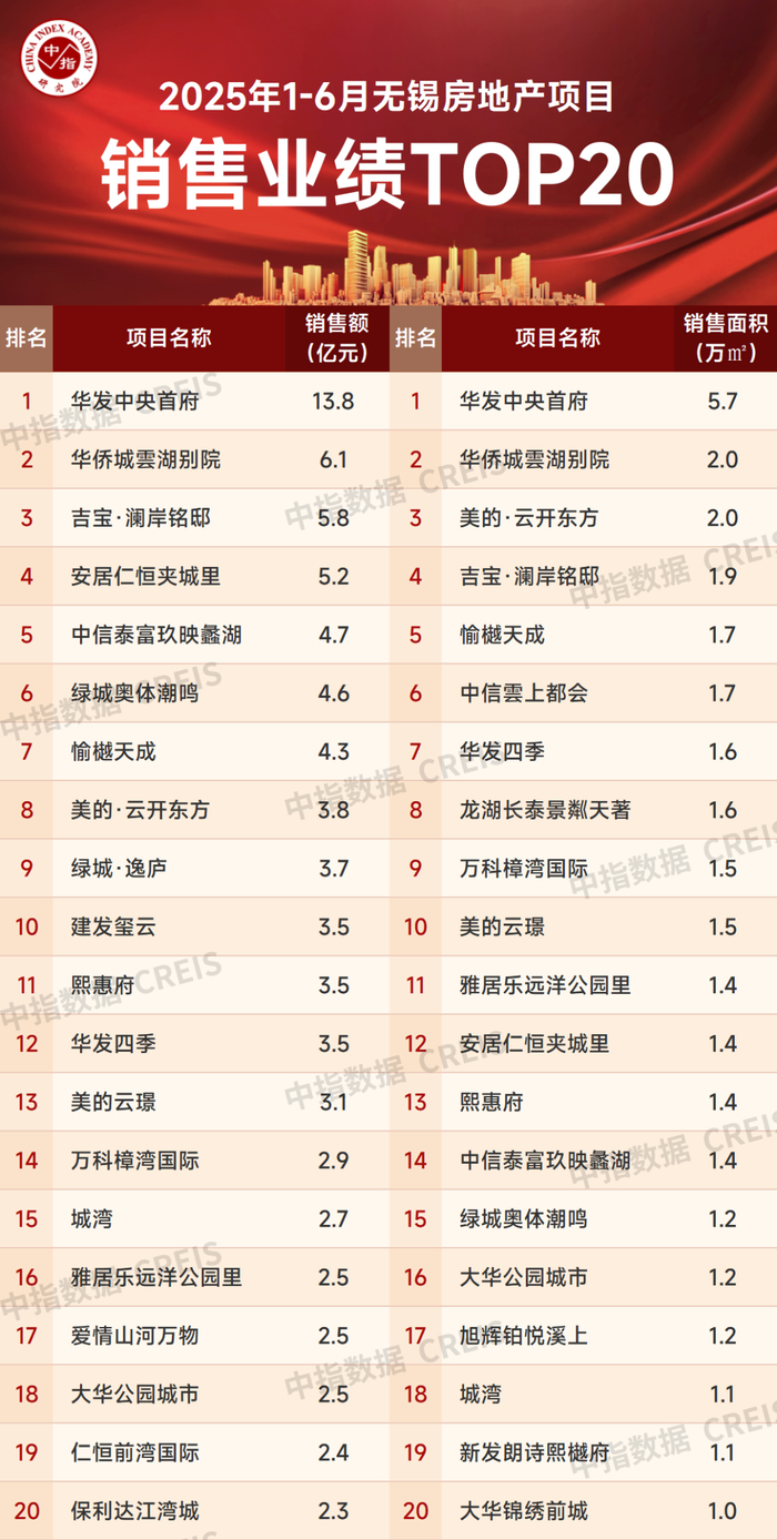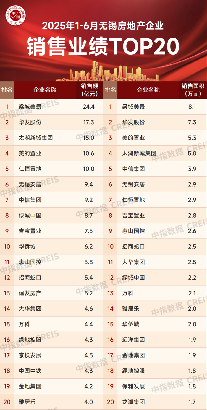 特别声明:房地产企业销售数据统计是以2025年1月1日-6月22日期间销售的商品房为统计口径,主要依据中指数据CREIS(点击查看)在无锡市区(不含江阴、宜兴)的销售监测数据,并参考当期总体经营情况和推盘去化情况进行分析统计;对于少数没有在监测范围内的项目,由企业提供相关证明文件,经课题组对数据进行严格审核,也纳入统计范围。本报告仅供参考,课题组不对使用报告及其内容所引发的任何直接或间接损失承担责任。