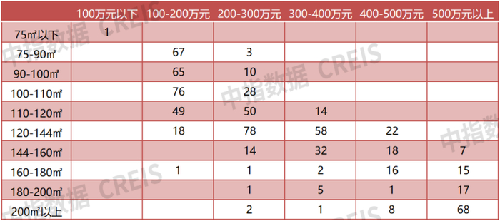 2025年6月,从面积段和价格段来看,120-144㎡面积段、200-300万元价格段销售最为热门,成交78套,占比10.43%。
