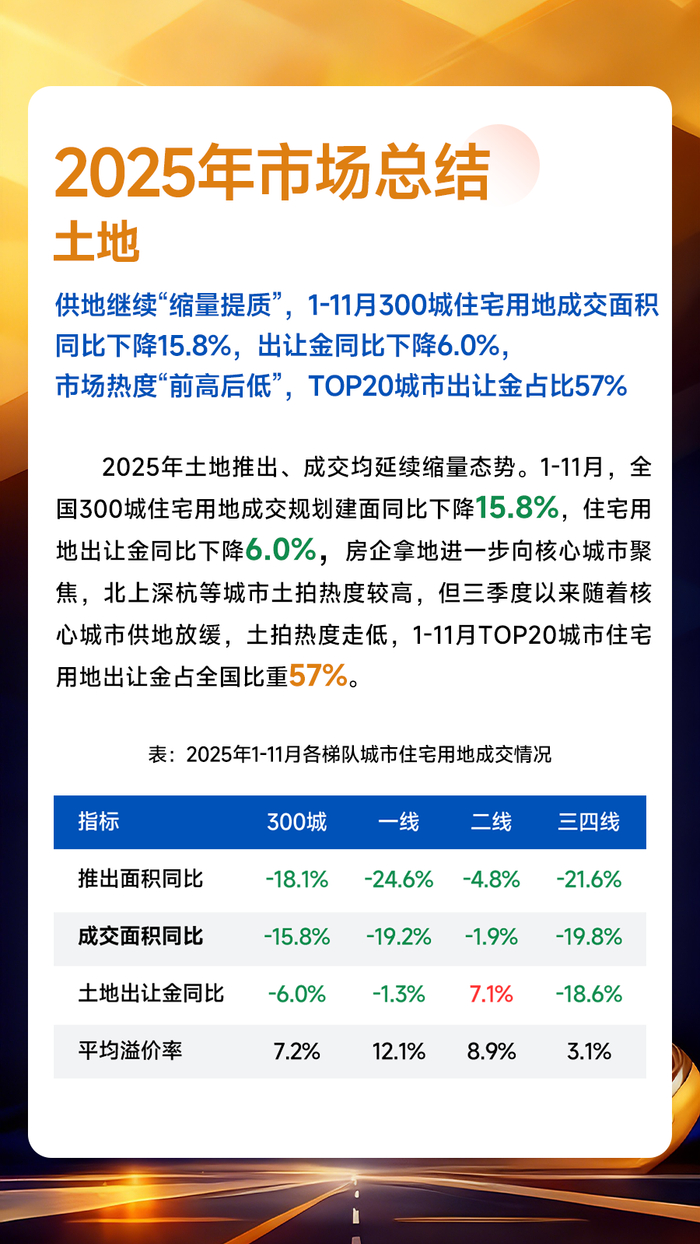 土地方面,2025年各地政府保持“缩量提质”供地策略,今年截至12月9日,300城住宅用地成交规划建面同比下降13.0%,出让金下降6.7%。房企拿地进一步向核心城市聚焦,城市集中度方面,今年截至12月9日,TOP20城市住宅用地出让金占全国比重为55%,TOP10城市占比超40%;杭州、上海、北京成交金额均超千亿元,但多数城市土地出让金同比下降。