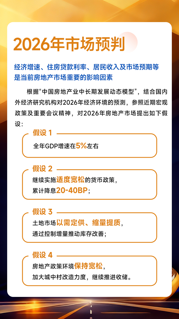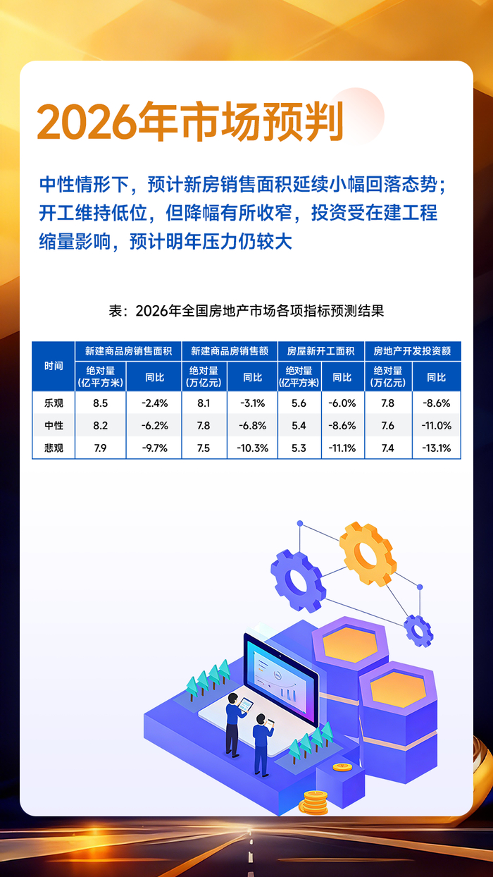 展望2026年,经济基本面的好转与居民就业收入预期的改善,是促进市场恢复的重要基础。根据“中国房地产业中长期发展动态模型”测算,中性情形下,预计2026年全国新建商品房销售面积同比下降6.2%,降幅较今年有所收窄,市场分化态势延续,“好城市+好房子”仍具备结构性机会。新开工、开发投资或延续下行态势。