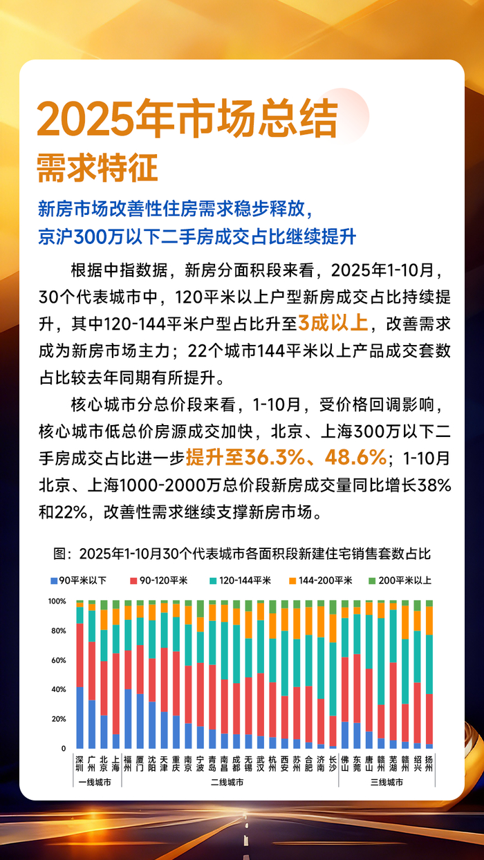 需求特征方面,2025年以来,重点城市高总价改善楼盘去化表现良好,带动30城120平米以上户型新房成交占比持续提升,其中120-144平米户型占比升至30%,改善需求仍为新房市场重要支撑。二手房方面,近两年二手房价格持续调整,成交总价段有所下移,京沪300万以下刚需房源成交同比增幅明显,500万以下房源占比均在七成左右,是二手房主流需求。