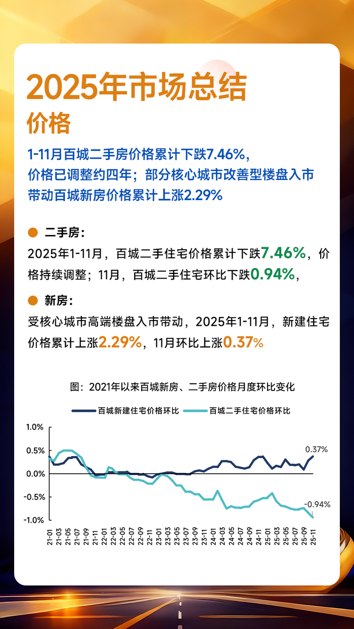 房价方面,根据中国房地产指数系统百城价格指数,2025年1-11月,百城二手住宅价格累计下跌7.46%。部分核心城市改善楼盘入市带动百城新房价格累计上涨2.29%,涨幅较2024年同期持平,但城市间分化显著,三四线城市以消化库存项目为主,价格整体面临压力。