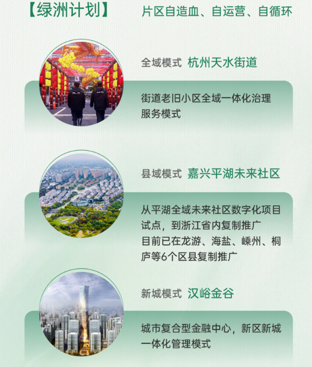 绿城服务不局限于传统服务业态,专注产品创新,不断探索服务新模式,实施以全域、县域、新城三大服务产品为模型的“绿洲计划”,初步实现片区自造血、自运营、自循环,服务价值持续提升。
