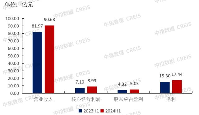 2024年H1,绿城服务营业收入为90.68亿元,较同期81.97亿元增长10.6%;毛利为17.44亿元,同比增长14.0%,毛利率同比上涨0.5个百分点,核心经营利润与股东应占盈利分别为8.93亿元与5.05亿元,较同期分别上涨25.8%与21.5%。