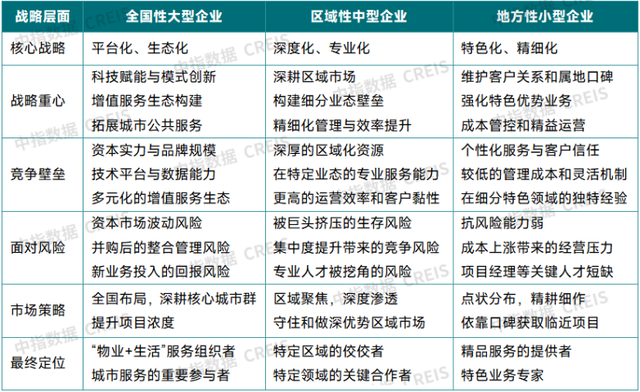 全国性龙头企业依托综合优势,其发展路径从单一的“规模驱动”,转向聚焦内生价值的“价值驱动”与“生态驱动”。区域性中型物企的战略关键在于“深度聚焦”:依托本土的深度耕耘,将区域优势转化为难以复制的服务壁垒,从而在细分市场或专业领域中建立不可替代性。地方小型物企在行业生态中占据独特的利基市场,其核心战略在于发挥口碑好和灵活性强的优势,通过高度差异化的服务实现韧性生存。