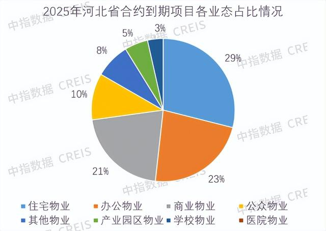 数据来源:中指研究院虽然公开招标中商业物业项目数量占比常被关注,但从存量到期市场来看,住宅物业是合约到期项目的最主要类型。根据中指数据库・物业版的监测,2025年河北省合约到期项目中,住宅物业占比最高,达到29%;其次为办公物业(23%)与商业物业(21%),三者合计占比超七成,反映出住宅与商办类物业是当前河北物业市场合约到期的核心板块。与此同时,公众物业(10%)、其他物业(8%)、产业园区物业(5%)、学校物业(3%)及医院物业(4%)等细分领域占比相对较小,也体现出存量到期市场的结构分化。