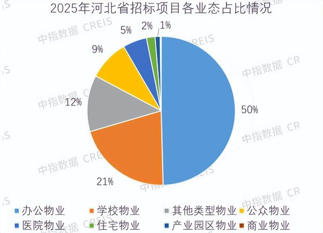 2025年已公布的物业管理行业相关招标信息已超过28万条,其中非住宅领域招标占比达96%。2025年河北省已公布的物业管理行业相关招标信息已达6402条。办公物业在招标项目中占比高达50%,是公开招标市场的绝对主力,反映出河北地区办公类物业对公开选聘物业服务的需求最为旺盛。办公物业加学校物业合计占比超七成,是当前河北物业公开招标市场的核心板块,这两类业态对物业服务的市场化采购需求更为突出。