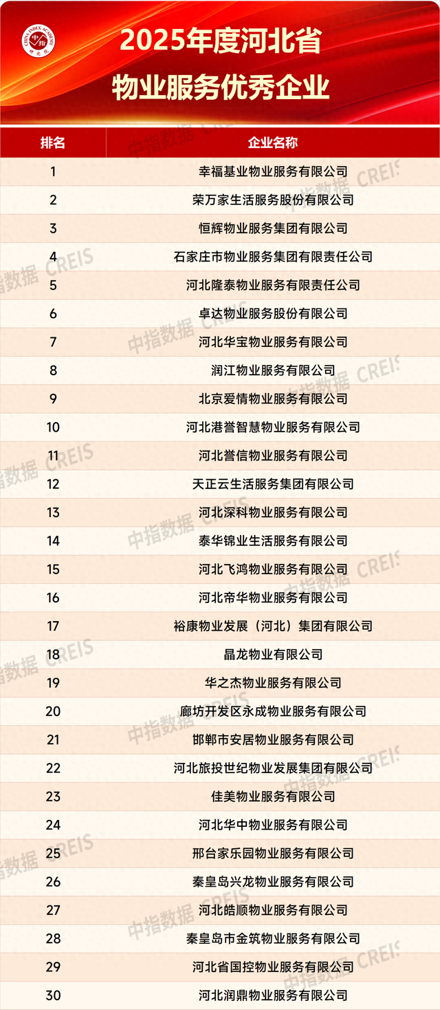 在此背景下,河北省物业服务行业也迎来了高质量发展的转型关键期,企业在精细化管理、数智化转型、人才建设体系等方面也取得了诸多亮眼成果,同时也涌现出一批行业标杆企业,为系统梳理发展成果,树立行业典范,中指研究院秉承公正、客观全面的原则,基于科学的方法体系对河北省优秀物业服务企业进行综合研究,隆重发布【2025年度河北省物业服务优秀企业】、【2025年度河北省主要城市物业服务优秀企业】。