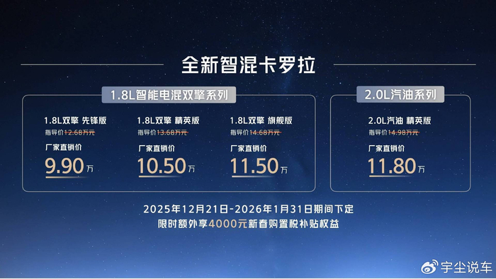 12月21日,“全球好品质 中国新家轿”全新智混卡罗拉焕新上市,共推出4个版本,厂商直销价为:9.9万元-11.8万元。即日起至1月31日期间下定,限时额外享受4000元新春购置税补贴权益。