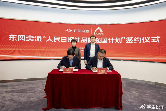 2026年1月11日,东风奕派“人民日报社品牌强国计划”签约仪式在人民日报社举行。人民日报文化传媒有限公司董事长寇非和东风汽车营销管理部总经理,东风奕派汽车科技公司党委书记、副总经理张俊出席仪式并见证签约。人民日报文化传媒有限公司副总经理郝立鹏与东风奕派营销事业部总经理余岳峰代表双方签署了协议。这一合作,意味着东风奕派正式融入“人民日报社品牌强国计划”大局,肩负起向世界展现中国品牌实力的时代使命。