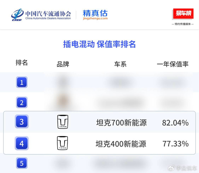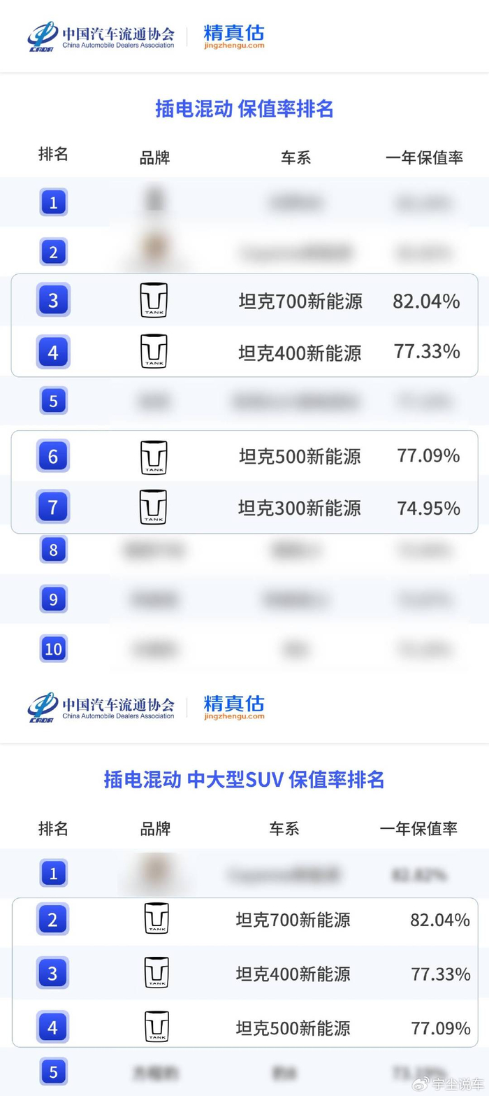 翻开榜单,坦克展现出的统治力令人称道:坦克300三年保值率高达65.90%,稳居紧凑型SUV全品类第一;坦克300 Hi4-T一年保值率74.95%,荣膺插混紧凑SUV冠军。更令人瞩目的是高端战场,坦克700 Hi4-T以82.04%的一年保值率,直接跻身插混保值率榜单前三,与问界M9、保时捷Cayenne等豪华旗舰并肩。