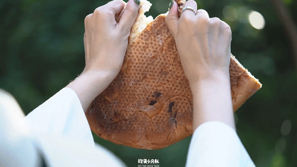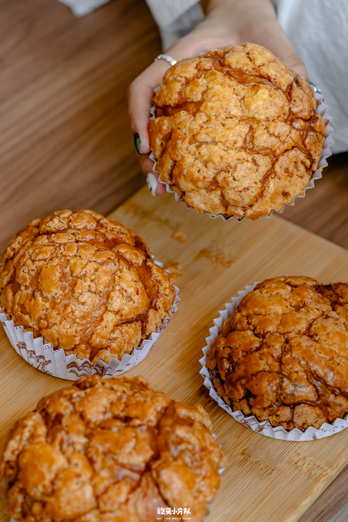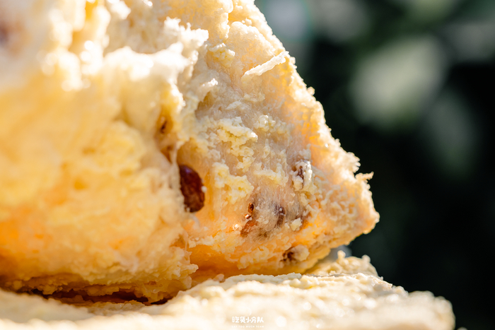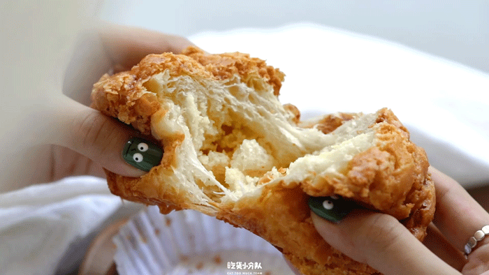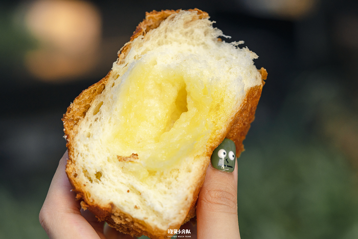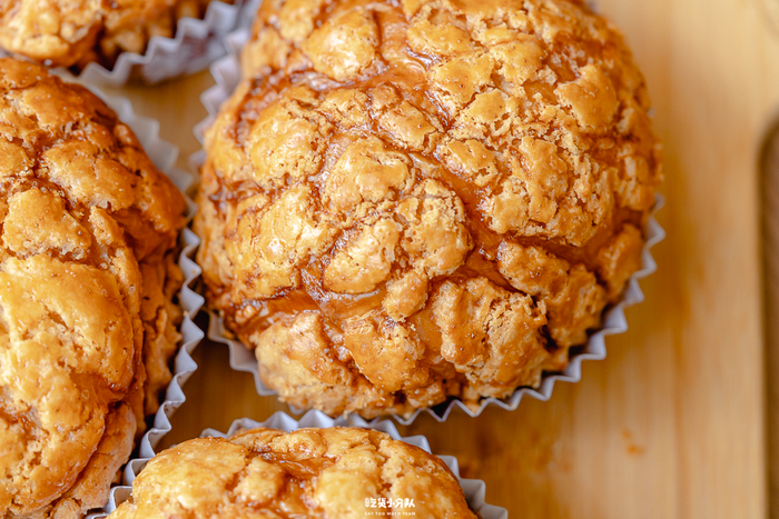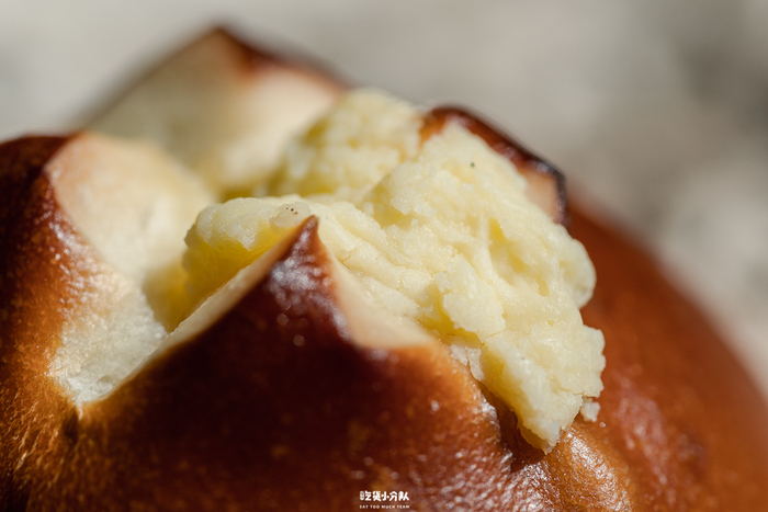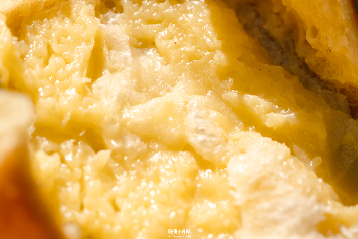 有奶酥内馅,不会过甜,整个面包主要的甜味源自于它。顶部的样子和港式菠萝包差不多,有焦糖味,很厚的酥皮香脆顶。