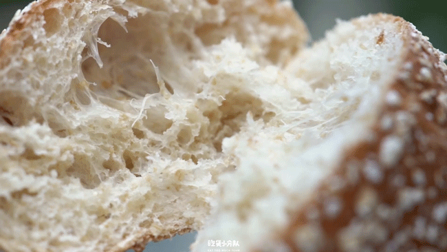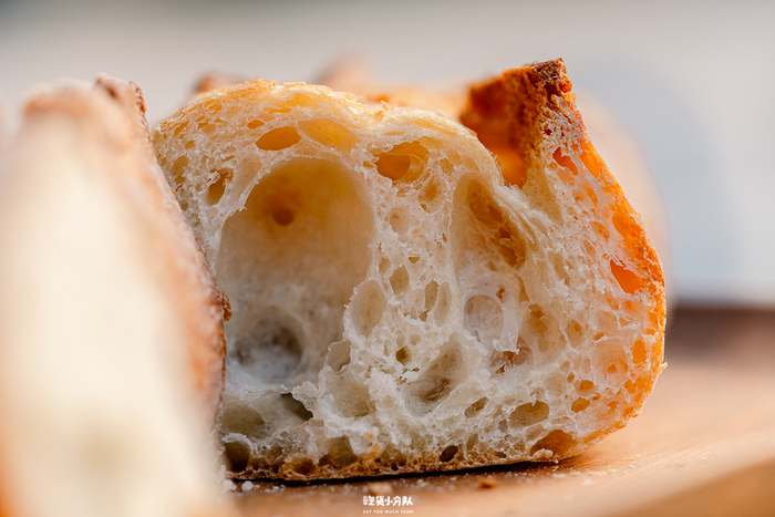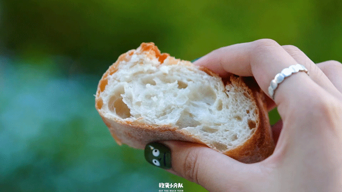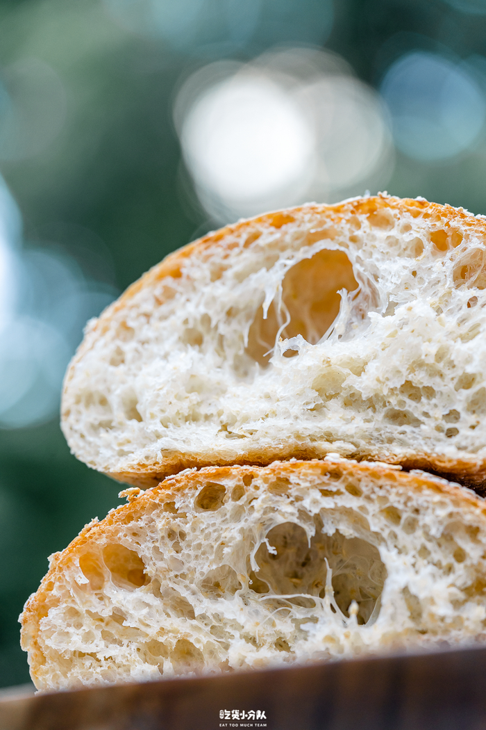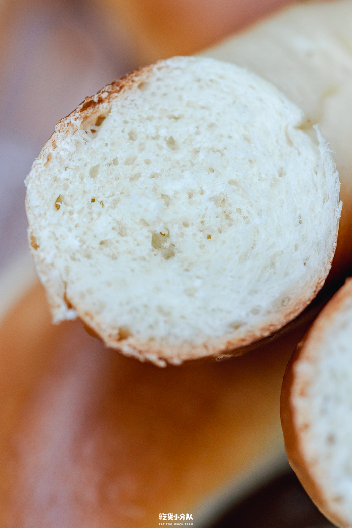 属于盒马现烤系列的法棍,由专门的面包师傅制作。9.9元一根的鲁邦种法棍,小麦味很重,配料表也特别简单:小麦粉、水、盐和酵母,钟情于无糖无油面包的朋友们会很爱。外壳挺硬,但面包心却很湿润有嚼劲,有标志的大气孔。