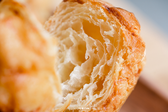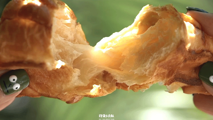 叫[菠萝萝可颂],是因为它拥有菠萝包的外皮,可颂的里子。味道偏甜,颜色会稍深,与烘烤时间有关。里面开酥做得还不错,没有馅料是原味的。放久了会变软,有条件的可以复烤,搭配火腿或煎蛋等。