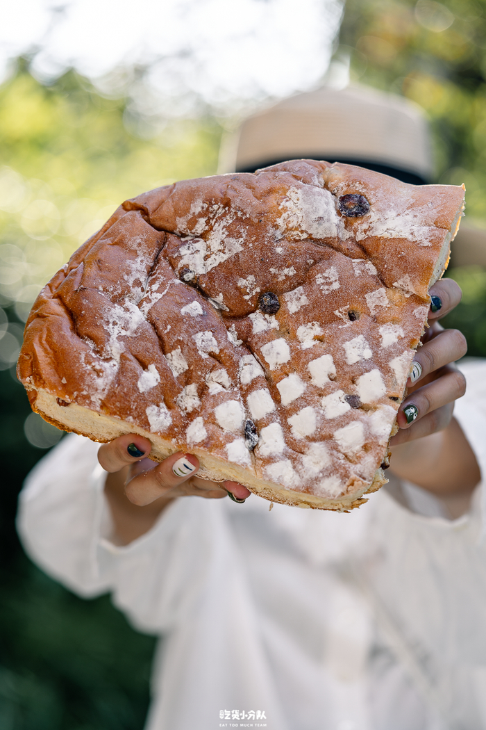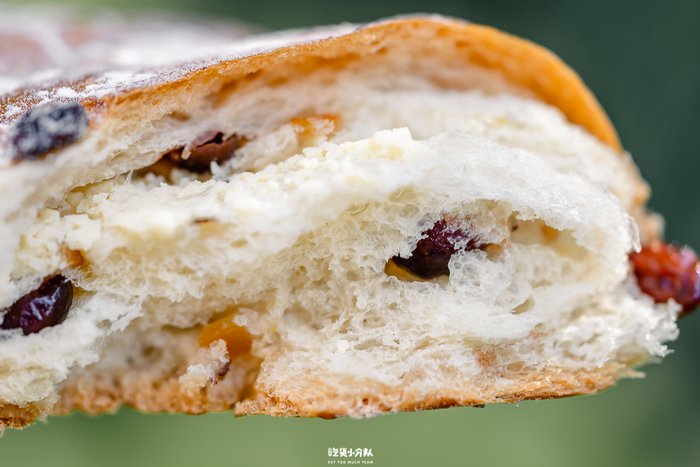 看到这个面包的第一反应是“大”,整体挺阔有厚度,让我想起了中国大饼。两个主打奶香的食材组合:忌廉和芝士,甜中带酸。放了蔓越莓、橙皮丁揉面包,有清新果香,但包体偏干且扎实。买回家后需要自己切分。相对于其他几家超市在售同款而言,芝士的用量少一些,因此价格比它们低。