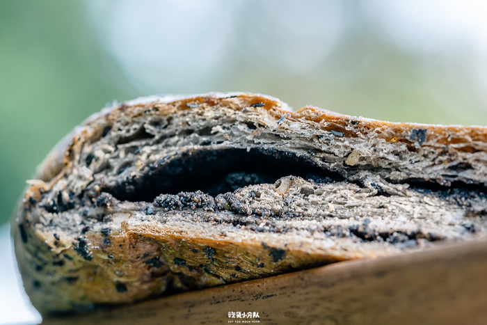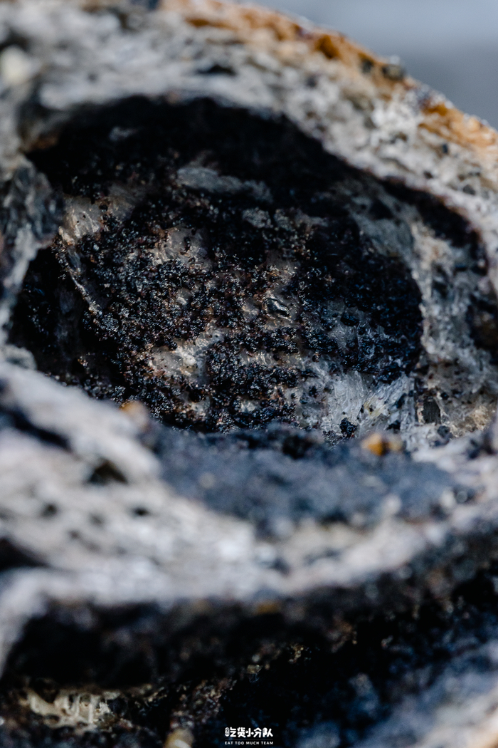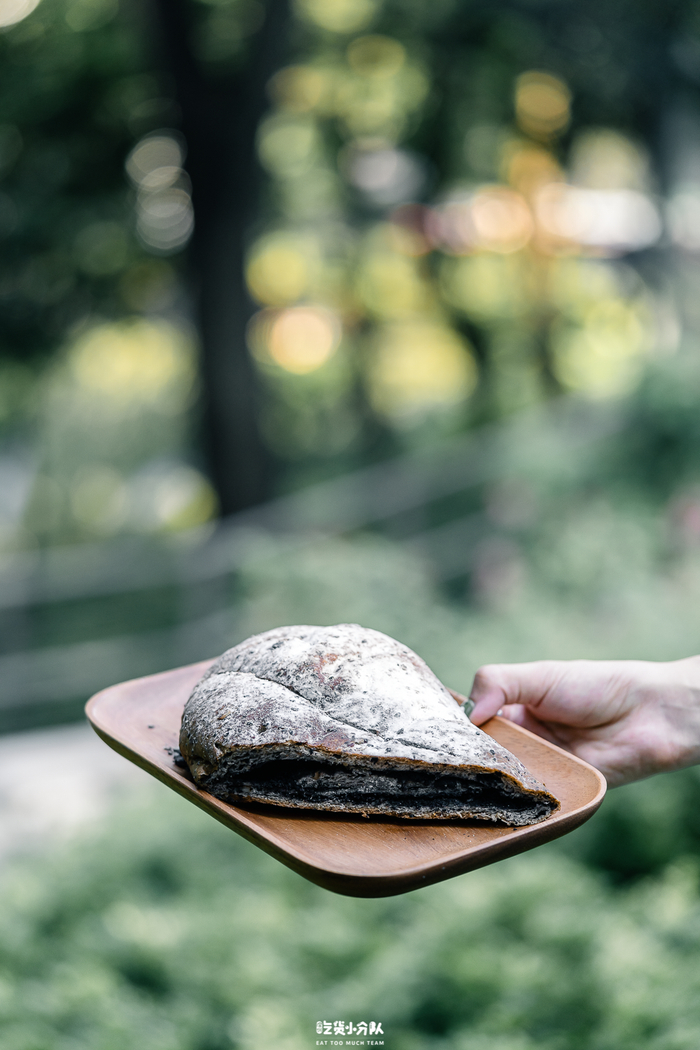 整个面包体是黑色的,裹着厚厚一层炒香的黑芝麻馅,又甜又香。口感比软包偏硬些,外皮挺有韧性和嚼劲,之间还有一颗颗的核桃仁碎,谷物清香算是到位的。12.8元,个头挺大,切分成一段分享着吃更合适。