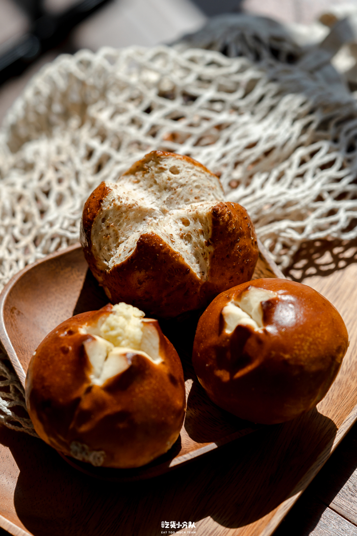 碱水球也是精品面包店的常见款。盒马的碱水小球组合有三个口味:全麦、奶酪和红豆各1个。奶酪味的是比较多人好评的,内里的奶酪夹心给得挺足。红豆内馅不会齁甜。总体而言,面包的碱水味比较淡,没有与内料很好的融合,但口感是有嚼劲的。折算下来,性价比不高。
