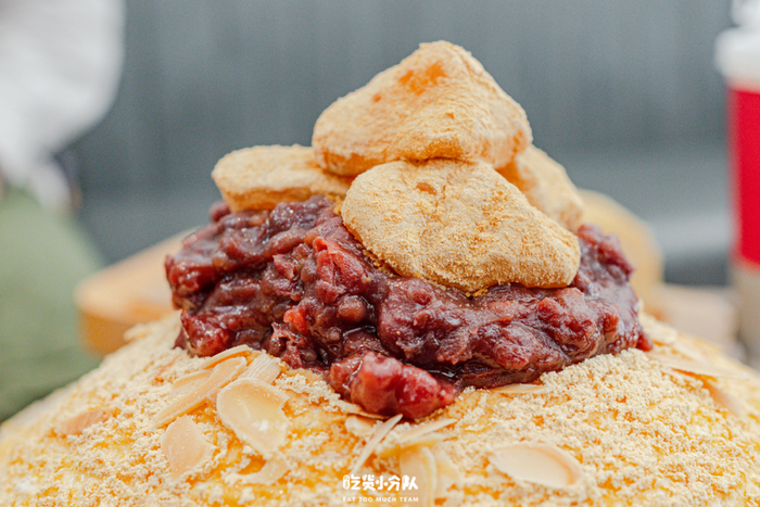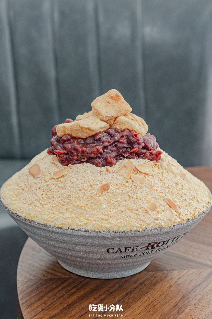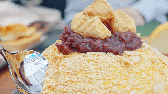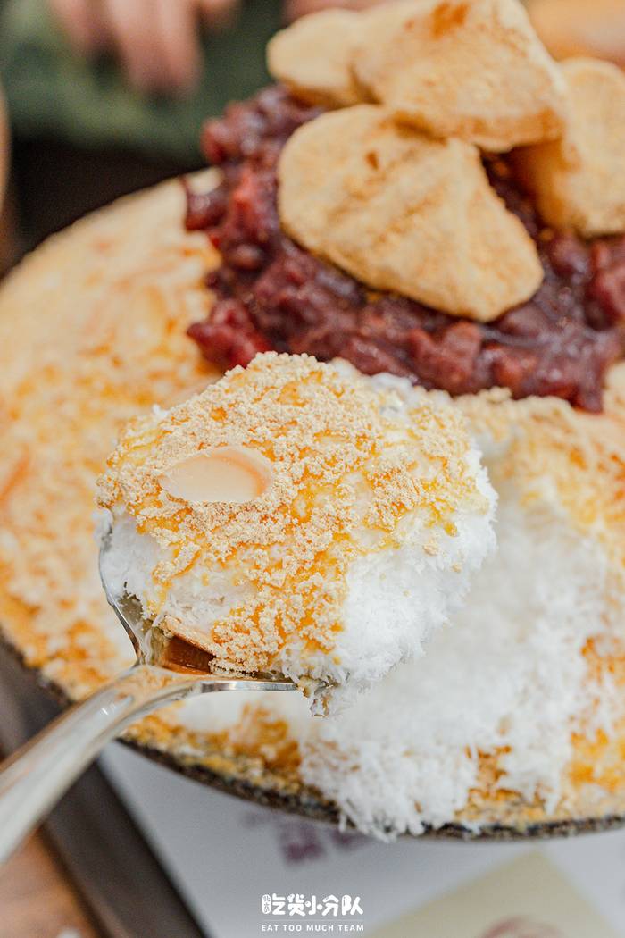 我们点的【红豆年糕雪冰】,雪冰很细密,是可以尝出甜甜的奶味的!而且除了表面上可以看到的黄豆粉年糕、红豆,挖到里面居然还有很多!我们3个人分食一碗正合适。