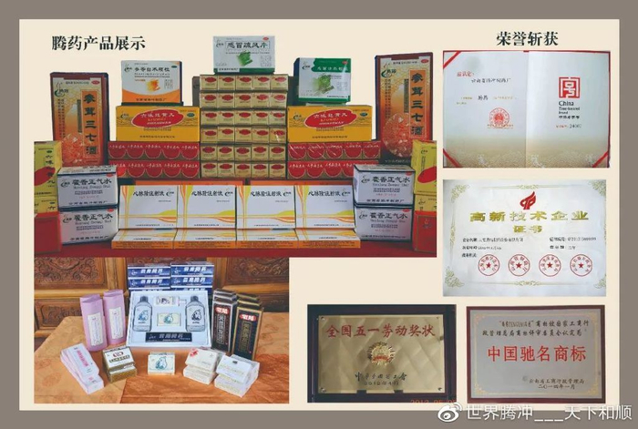 腾冲有云南腾药制药股份有限公司和云南腾冲东方红制药有限责任公司两家传统制药企业,两户企业均为规模以上工业企业和国家级高新技术企业。“腾药”商标连续18年认定为云南省著名商标,2014年认定为中国驰名商标,被评为“中华老字号”。云南腾冲东方红制药有限责任公司研发生产的“肠胃宁片”入选国家中药保护品种,“东方”商标被认定为云南省著名商标。