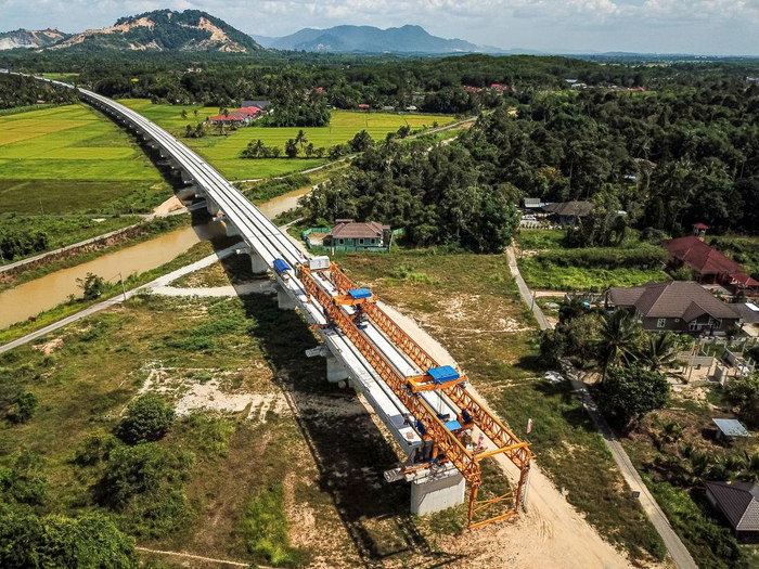 这是4月26日在马来西亚吉兰丹州拍摄的马东铁项目一分部5号桥建设现场(无人机拍摄)。新华社记者朱炜摄佐哈里说,马来西亚东海岸拥有迷人的自然风光和丰富的文化资源,但多年来缺乏投资和联通,被看作是“几乎被遗忘”的地方。“一带一路”框架下的马东铁项目对促进当地经济发展、基础设施建设与联通、增进民生福祉有着重要作用,马来西亚人民期待项目早日完工。