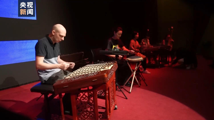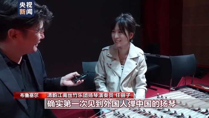 清韵江南丝竹乐团扬琴演奏员 任丽子:技术方面,技巧方面,它就是一个轮音。他现在能保持这么密的频率,其实是花了很多时间、下很多功夫去练习的,轮音至少要练个三年,才能把手速练出来,至少的。确实第一次见到外国人弹中国的扬琴。