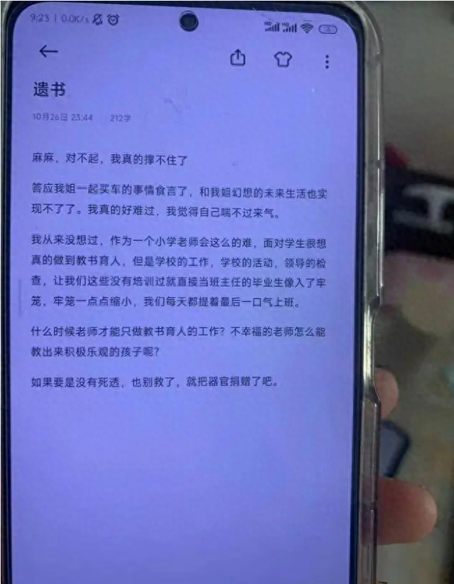 10月31日,郑州管城区建兴路小学一女教师吕某留遗书后去世引发关注。据媒体报道,吕某姐姐称,事发10月26日,警方告知家属妹妹系自杀。家属称,今年23岁的吕某于2022年6月大学毕业,2023年8月考入该校任教并担任班主任,平时性格开朗。家属所提供的吕某遗书显示,吕某称除教学工作外,应对上级检查,拟写材料等课外行政工作压力大。管城区教体局工作人员称,对此事深感遗憾,相关部门已介入处理此事。