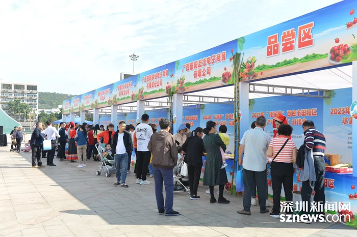 活动现场人头攒动。据悉,近年来,田阳区围绕“农业强区”战略,全面实施“产业富民”行动,大力发展芒果和圣女果“一红一绿”支柱产业,全区水果种植面积50.6万亩、蔬菜种植面积达40万亩,其中,番茄全年种植面积达23万亩、产量66万吨、产值超过19亿元;芒果种植面积43.3万亩、产量36万吨、产值超过18亿元。自深圳市和田阳区结对帮扶以来,田阳区积极引导“深企入桂”,促进田阳区农业产业提质升级。目前,田阳区累计建成3个粤港澳大湾区“菜篮子”基地、2个深圳市“菜篮子”基地、4个供应深圳农产品示范基地、6个“圳品”基地,认证11个“圳品”产品。