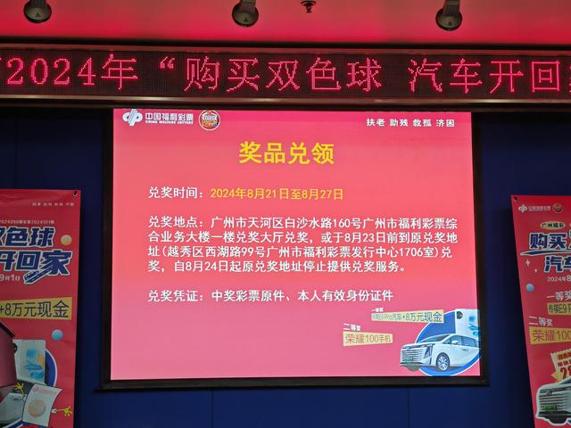 广州福彩8月5日起逢周三送汽车,每周2台车,连送4周!8月21日上午,广州市福彩中心举办了2024年“购买双色球,汽车开回家”活动第二期抽奖仪式,本期2个一等奖“广汽传祺E9 Pro汽车+8万元现金”分别花落天河区和从化区。