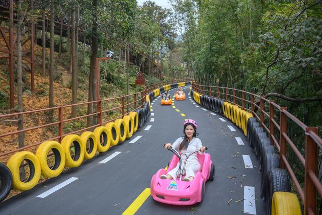 其中,全新推出的峡道飞车全长3680米,跨越3座山峰,依山取势,蜿蜒起伏,一弯接一弯,全程落差高达260米,最高时速可达30km。赛道设计融合了多种复合型弯道,包括多个直角弯、发夹弯、360度螺旋弯、8字回旋弯等28个极具挑战性的弯道,是目前国内最长、弯道最多的山道滑车项目。