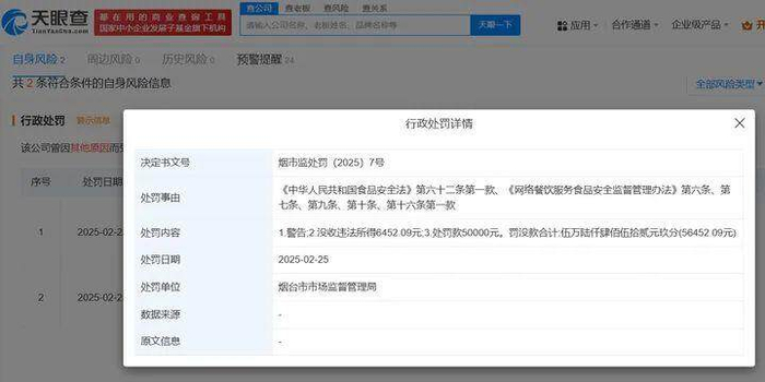 处罚信息显示,山东烟文网络科技有限公司对60家入网餐饮服务提供者未有效履行食品经营许可证审查登记义务,未建立并执行入网餐饮服务提供者审查登记、食品安全违法行为制止及报告、严重违法行为平台服务停止、食品安全事故处置等制度,未设置专门食品安全管理机构,配备专职食品安全管理人员,未在主页面公示餐饮服务提供者的食品经营许可证,未在网上公示餐饮服务提供者的名称、地址、量化分级真实信息,未对入网餐饮服务提供者的经营行为进行抽查和监测。当事人对审核不到位的60家入网餐饮服务提供者收取平台跑腿费共6452.09元。涉案货值金额6452.09元,违法所得6452.09元。