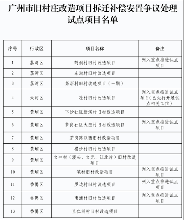 据了解,鹤洞村旧村改造项目、冼村旧村改造项目等13个项目(见下表)列为广州市旧村庄改造项目房屋拆迁补偿安置争议处理试点项目。