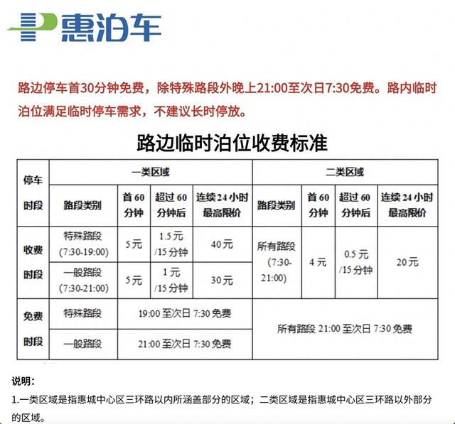 根据惠泊车发布的收费标准,路边停车首30分钟免费,除特殊路段(19:00至次日7:30免费)外,其余的21:00至次日7:30免费。实行差异化收费:一类区域(三环内)1小时内5元,其中特殊路段超过1小时后每15分钟1.5元,全天最高40元,一般路段1小时后每15分钟1元,全天最高30元;二类区域(三环外)1小时内4元,1小时后每15分钟0.5元,全天最高20元。