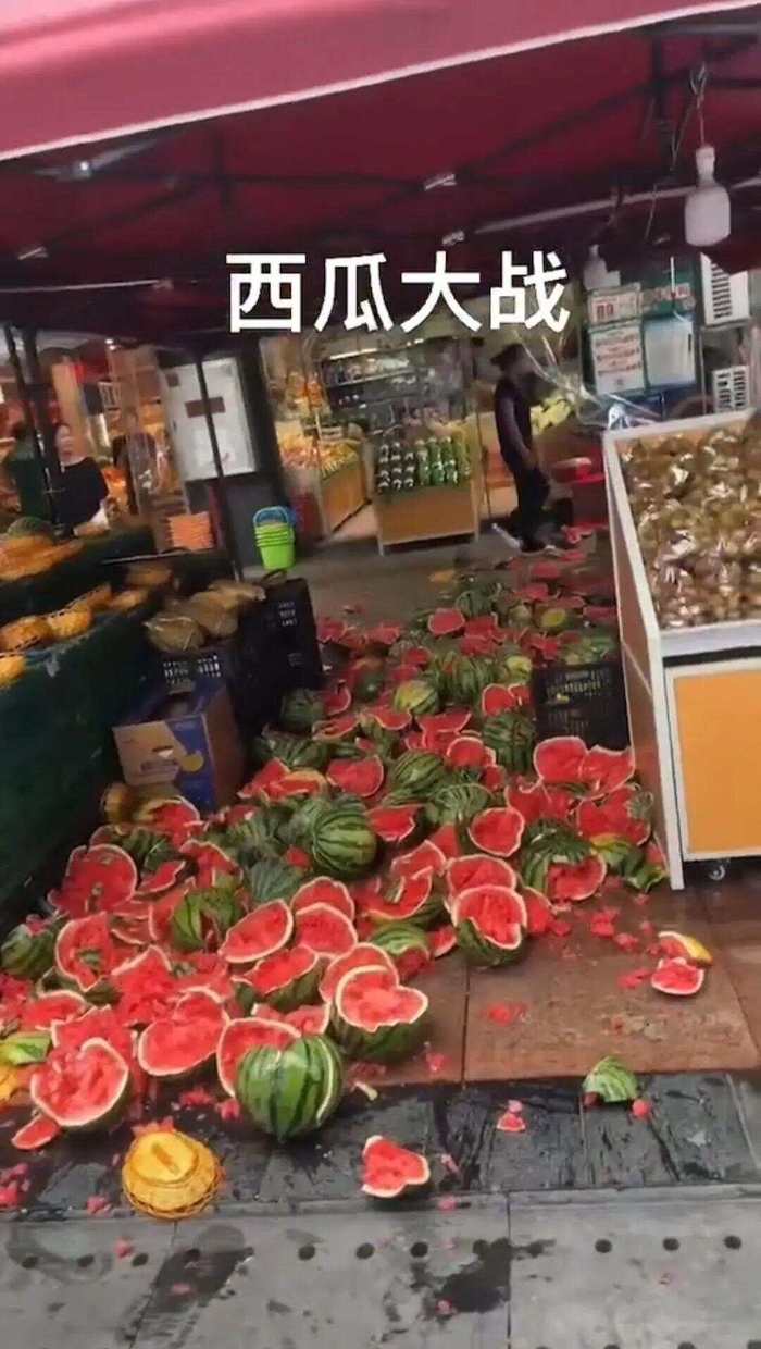 多段视频显示,两家水果店门前的空地上,西瓜被砸得满地都是,现场还有人抱着西瓜往地上砸。多名网友留言表示,视频中起争执的两家店,是位于重庆财信城市国际小区附近的一家百果园店和一家鲜丰水果店。