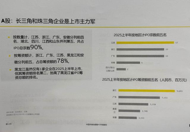 报告显示,在A股市场,按数量计算,广东和浙江并列第二,江苏名列第一;按筹资额计,浙江、广东、江苏分列前三名。港股IPO市场迎来强劲复苏,内地企业数量和筹资额分别占总量的95.0%和96.7%,继续主导香港IPO市场。