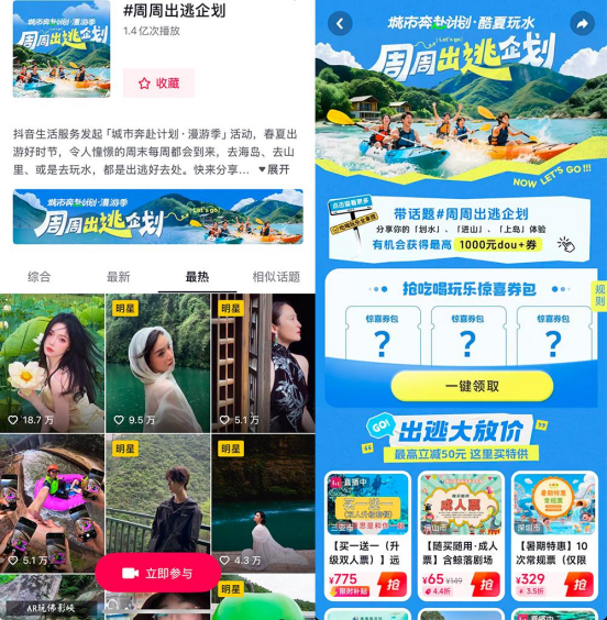 活动中,抖音生活服务联合四川、广东、重庆、贵州、海南、广西、云南、福建八省份文旅,围绕“上岛、进山、划水”三大主题,深挖当地文旅资源,为游客提供出游优惠。游客无论是到海南岛、大湾区海岛游,还是赴重庆仙女山、泉州石牛山山野游玩,或是深入什邡蓥华大峡谷、施秉杉木河漂流等,都可以享受门票、酒店、餐饮等一站式出游服务。