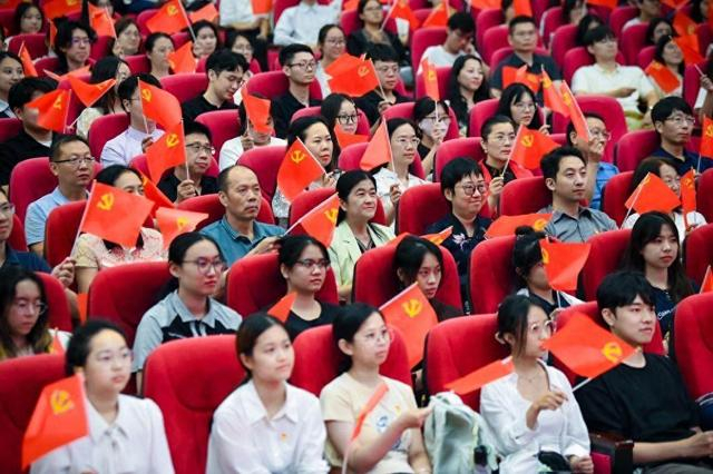 “满腔的热血已经沸腾,要为真理而斗争……”当《国际歌》的旋律响起,全场观众不约而同地跟着哼唱,熟悉的旋律在报告厅内回荡。党课通过丰富的影音视频资料和生动的舞台表演,让红色脉络更加可亲可感。