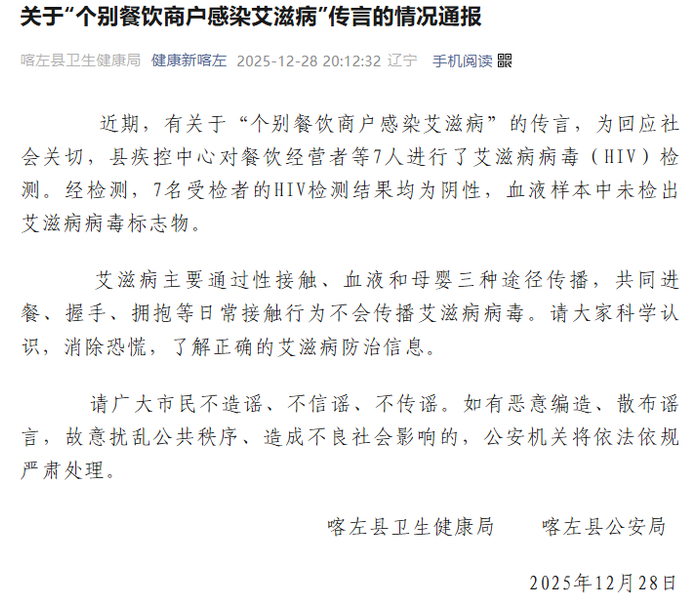 12月28日,辽宁喀左县卫生健康局和公安局发布情况通报,回应“个别餐饮商户感染艾滋病”传闻: